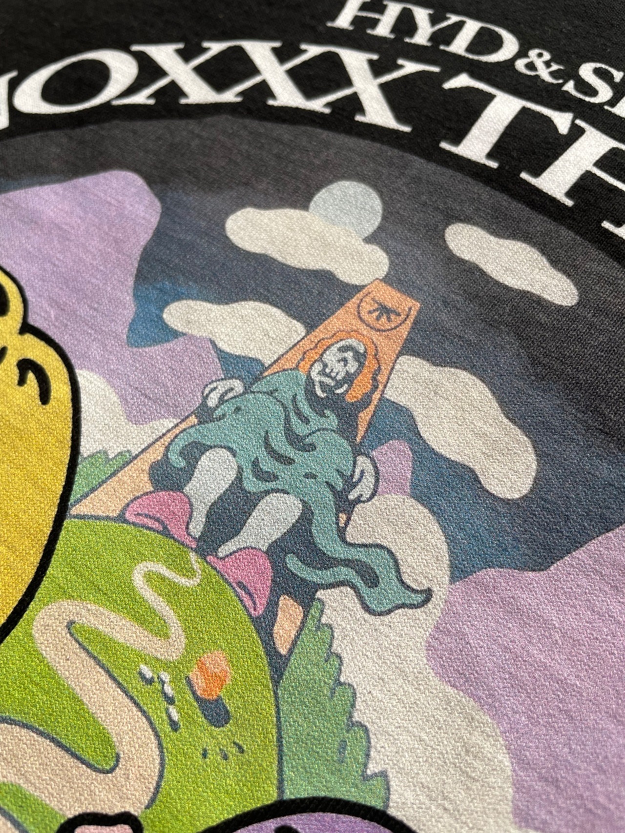 メイングラフィックは HYD&SEEK の大型アクリル画を撮取して使用。袖には道中の彼らをシルエットで表現した垂涎必至の一着。